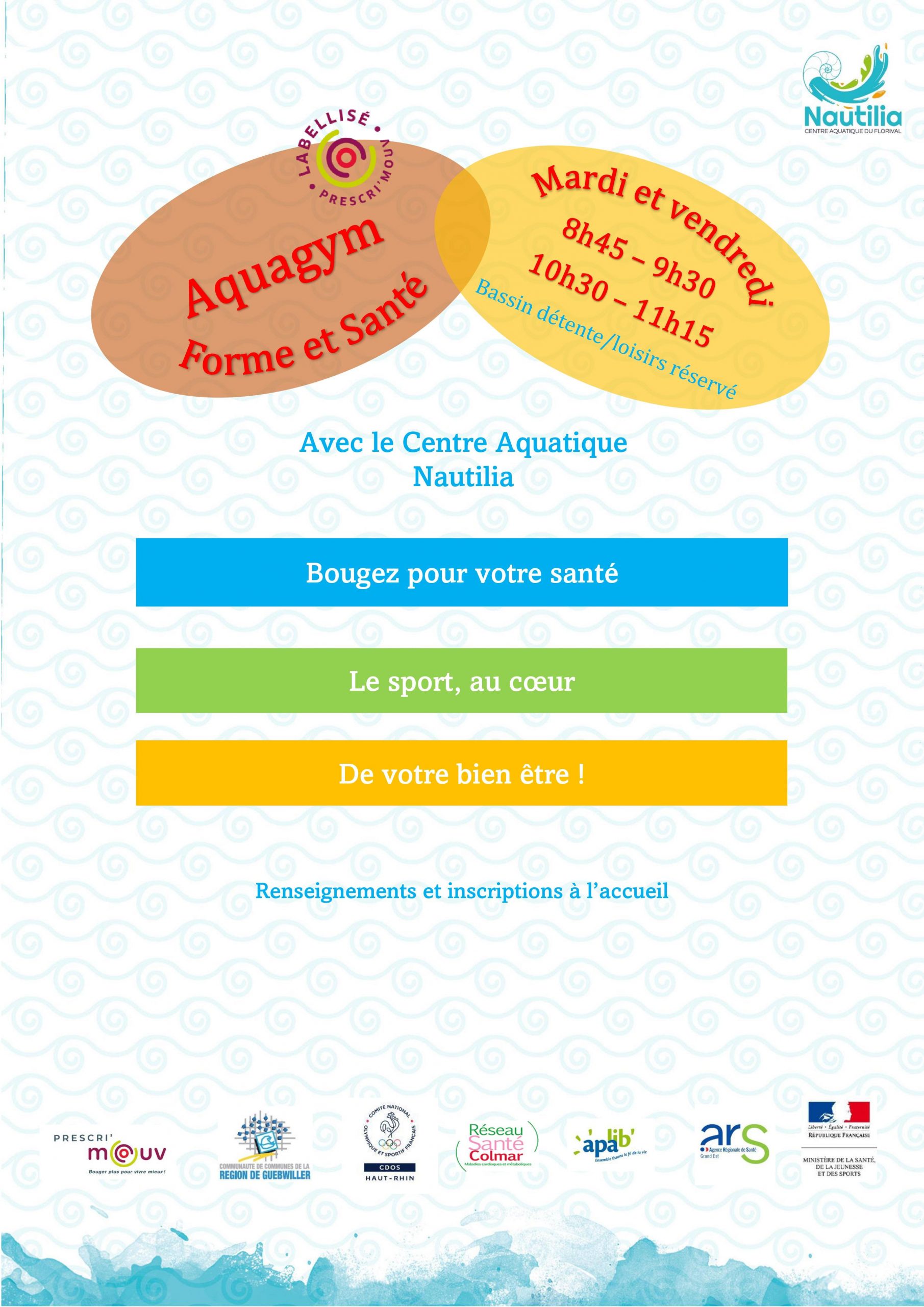 2 cours d'aquagym, le mardi et vendredi de 8h45 -9h30 et 10h30 - 11h15